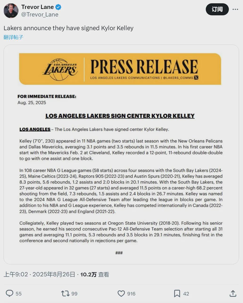 北京时间8月26日,洛杉矶湖人官方宣布:正式签下中锋凯勒-凯利。这是一份Exhibit 10 合同,也就是训练营合同。签下Exhibit 10合同的球员,如果赛季开始之前被裁,最多能拿到8.53万美元的奖金,有资格加盟该队在发展联盟的附属球队。