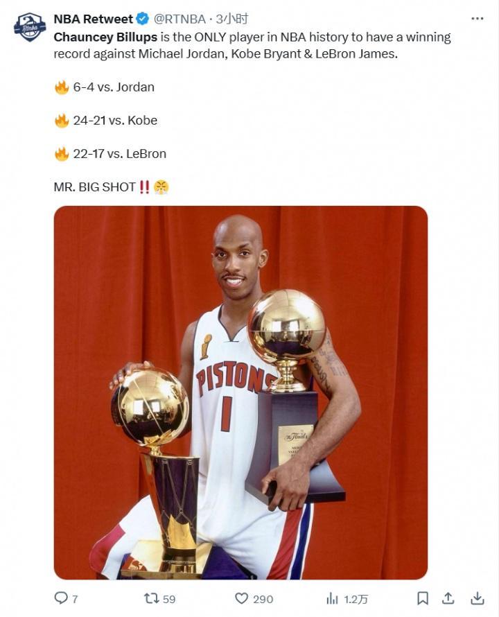 美账号NBA Retweet晒出一组数据:昌西-比卢普斯是NBA历史唯一一名,职业生涯对乔丹、科比、詹姆斯交手战绩都占上风的球员!VS乔丹 6胜4负VS科比 24胜21负VS詹姆斯 22胜17负...
