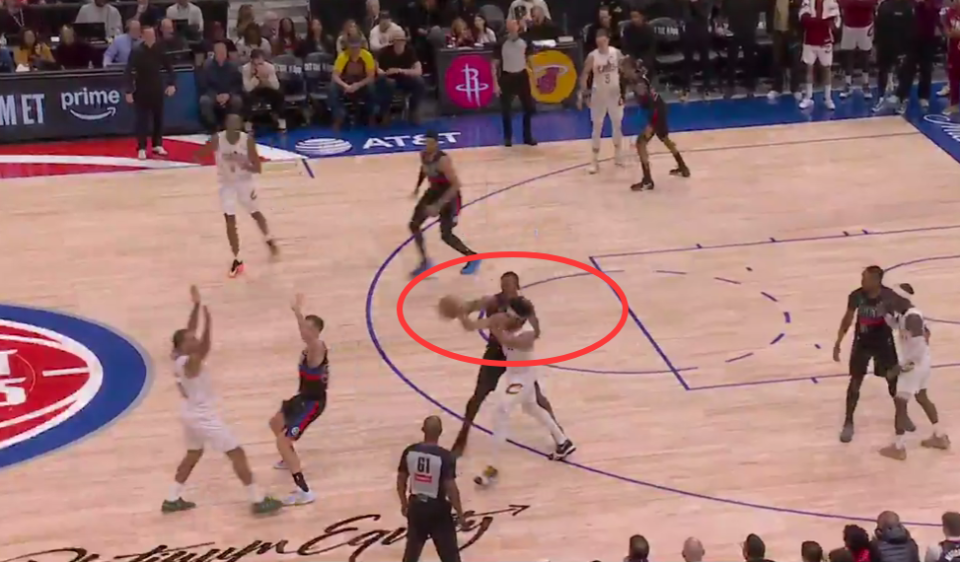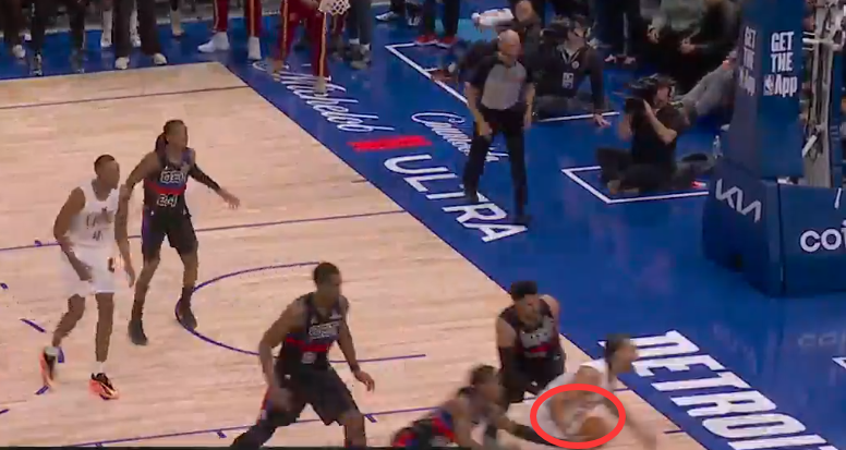 第一次是漏判,发生在距离第四节结束还有1分30秒。杜伦的手从球上滑开,主动接触到了艾伦的手腕,影响了他完成预期传球的能力。这次非法接触导致了艾伦的传球失误。这本该吹杜伦防守犯规,但裁判没有响哨,这是一次漏吹的防守犯规,并导致骑士失误,对手抢断得分。活塞获利,骑士吃亏。