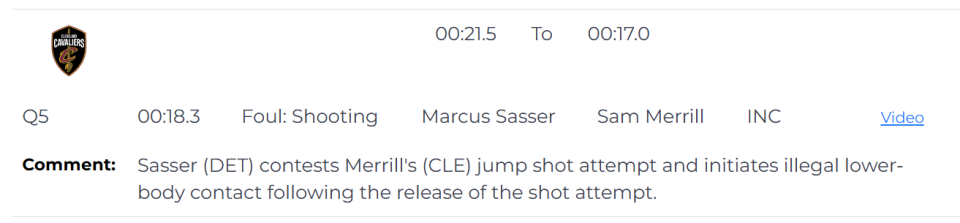 第四次是漏判,发生在距离加时赛结束还有18.3秒,萨瑟在梅里尔三分跳投出手后,主动用下肢进行了非法接触,干扰了他的投篮。这是一次漏吹的防守犯规,梅里尔本该获得三次罚球机会,有望扳平比分。活塞获利,骑士吃亏。