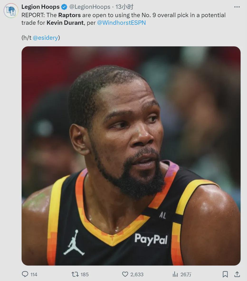 杜兰特没有交易否决权,太阳可以强制把他送到猛龙或者森林狼。需要注意的是,杜兰特现有合同2026年夏天到期,仅剩1年5328万美元。所以森林狼跟猛龙也得想清楚,付出巨大代价,仅得到杜兰特一年的使用权,到底值不值?