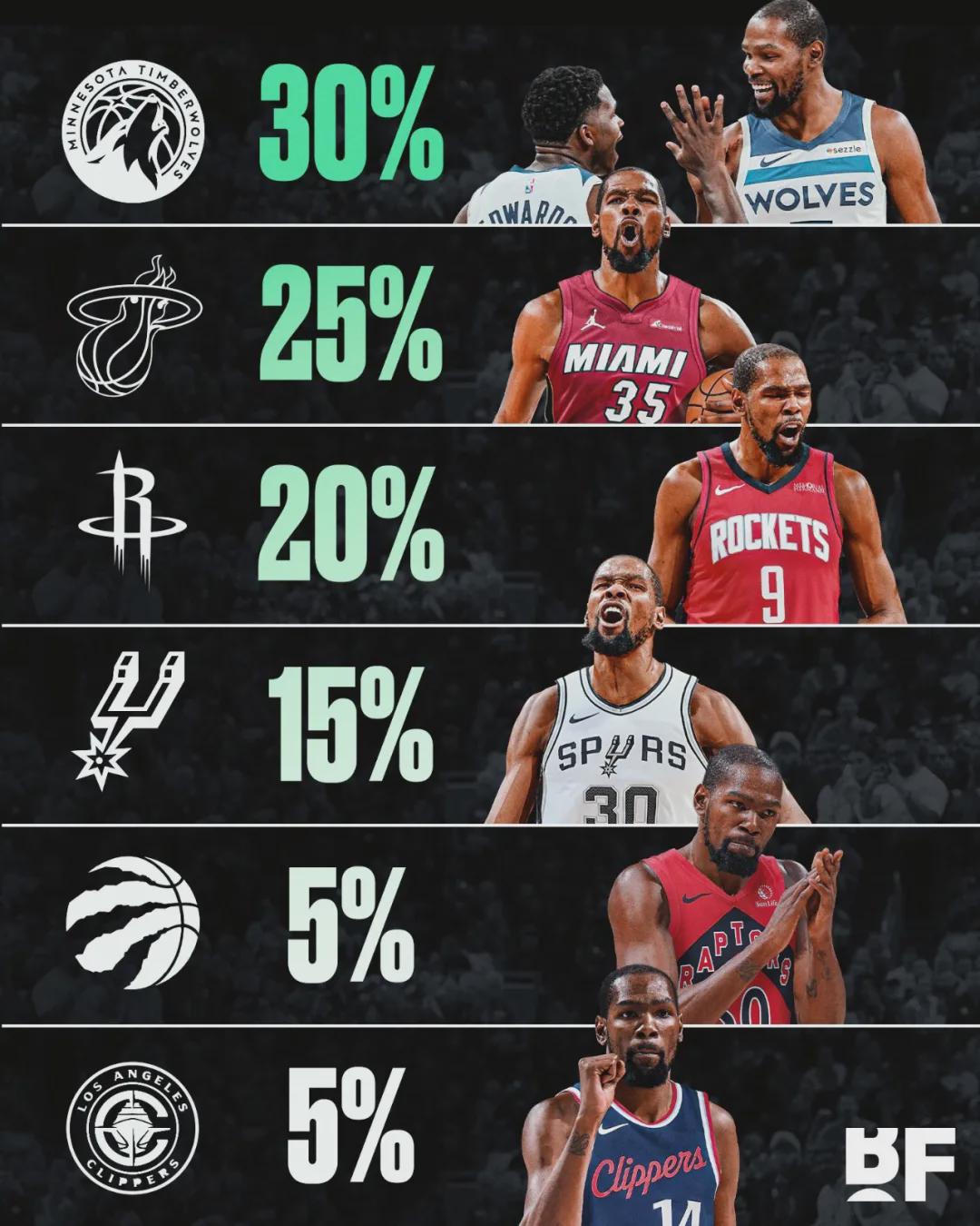 杜兰特为什么不想去森林狼?他没有明确回应。教主猜测城市跟气候可能是其中一个原因,明尼苏达的冬天寒冷且漫长,这里也没有大城市那么多娱乐活动。火箭的报价是杰伦-格林+今年首轮10号签,太阳想要小贾巴里-史密斯。